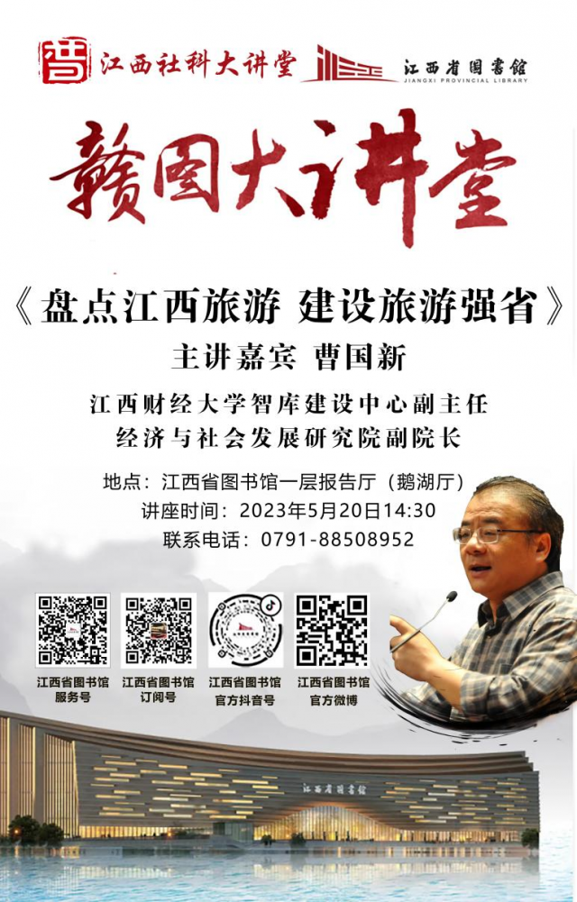 5月20日下午,江西省社联、江西省图书馆主办的《赣图大讲堂》特邀我校智库建设中心副主任、经济与社会发展研究院副院长曹国新副教授,在省图新馆鹅湖厅作题为“盘点江西旅游建设旅游强省”的讲座,线上线下共有1300余名读者参加。