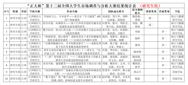 经过前期校赛、企业命题赛、省赛的层层选拔,江西赛区最终共有8支队伍晋级全国总决赛,其中包含我校统计与数据科学学院2支队伍:由刘述煌、邹立华、周辉、伍洲豪、胡迎涛五位同学组成的“每天学习强国队”,凭借作品《学而时习之,不亦说乎——南昌市“学习强国”APP用户体验调查》(指导老师:陶春海、谭利)斩获全国一等奖,也是我校研究生首次获得全国一等奖;由田梦琴、熊可、邹桂芳、邹子怡、张徐茜露五位同学组成的“医路快车队”,凭借作品《陪诊有我,医路快车——基于江西省有偿陪诊服务发展现状及前景调查研究》(指导老师:刘展、魏和清)获得全国二等奖。