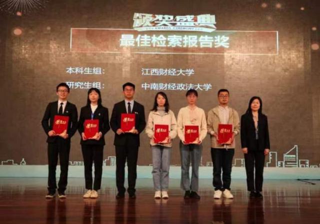 法学院李斌俊、金融学院欧阳锋诚、法学院杜郑念一同学组成的代表队荣获本科组一等奖第一名;法学院杨洲、会计学院陈姝妤、财税与公共管理学院周阳同学组成的代表队荣获研究生组二等奖;本科生队还荣获本科组唯一单项奖“最佳检索报告奖”;图书馆张春晖、陈香珠老师荣获最佳指导教师奖;江西财经大学荣获优秀组织奖。
