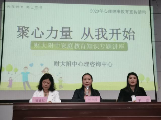 近日,附属中学针对1-3年级家长开展“聚心力量,从我开始”家庭教育知识宣讲活动。附中党总支书记叶申玲、心理咨询中心主任王莉及100多名家长参加了本次活动。活动由王莉主持。