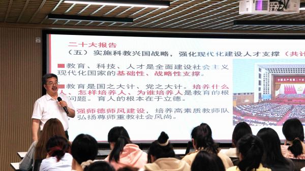 蒋金法详细阐述了党的二十大报告关于建设高校思想政治工作体系的新使命、新特征、新要求和新赋能。他指出,教师承载着传播知识、传播思想、传播真理的时代重任,是人类灵魂的工程师,是人类文明的传承者。教育是强国建设、民族复兴的基础支撑;教育是传承人类闻名,创造美好生活的重要力量。中国教育现代化要求我们必须更加注重以德为先、更加注重全面发展、更加注重面向人人、更加注重终身学习、更加注重因材施教、更加注重知行合一、更加注重融合发展、更加注重共建共享。他同时强调,确保教育现代化目标任务的实现,党对教育工作的全面领导是根本保证。要实现中国教育现代化,必须坚持“一个方向”“两个大计”“三个塑造”“四个服务”、五个“人”。把教育摆在优先发展的战略位置,把立德树人作为根本任务,把教师队伍建设作为基础工作,促进全体人民共同富裕的高等现代化,促进物质文明和精神文明相协调的高等教育现代化,促进人与自然和谐共生的高等教育现代化。