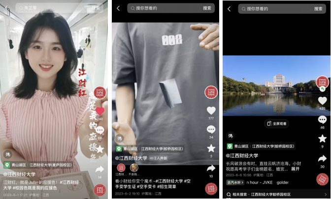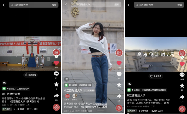 六个视频创意十足,别具特色,从不同的角度展现出江西财经大学的青春活力。有的将对联与篮球两种元素相结合,把高考祝福写成对联贴在篮球架上,祝福考生能“一举高中”“金榜题名”;有的通过热门歌曲舞蹈,在学校多个标志性建筑前拍摄取景,通过歌词和舞蹈传达对高考学子的诚挚祝福;有的通过蛟桥园、麦庐园、枫林园校庆的延时和航拍视频,向高考生展现江财校园全貌;有的响应抖音平台热点“校园色就是我的应援色”,向高考学子展示出“江财红就是我们的应援色”;还有创意视频“空手变出江财的学生证”,吸引高考学子报考江西财经大学,拥有属于自己的江财学生证;更有通过最新的AI技术自动生成的创意视频,祝福高考学子“金榜题名”“蟾宫折桂”。