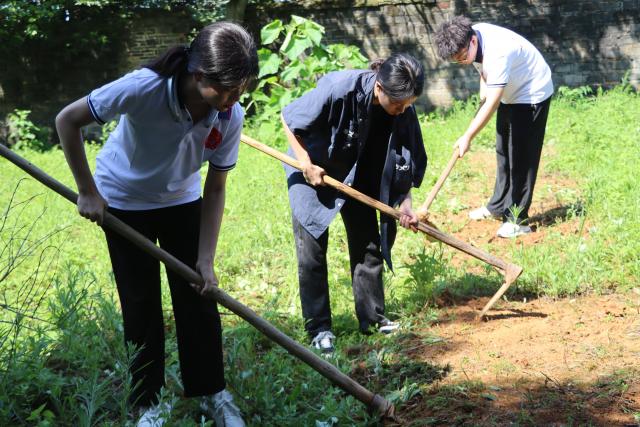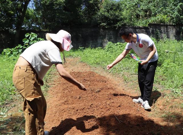 除草工作结束后,队员们开始了下一步的松土工作。队员们轮番接力,前面的人将土刨开,后面的人就将残余的土块捣碎。大家通力协作,流水作业,很快就将一方耕地整理完毕。这时,熊主任向大家介绍了条播的播种方法,将耕地整成一行一行的条形,行与行之间保持一定距离,并在行和行之间留有隆起,供农民走路、踩踏。实践队很快掌握了平地方法,也得到了熊主任的赞扬。
