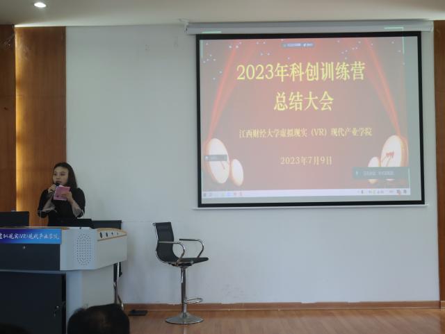 为总结科创训练营的实训经验,展示实训成果及鼓励先进,7月9日上午,虚拟现实(VR)现代产业学院科创训练营总结会在枫林园图书馆二楼报告厅举行。VR学院院长廖国琼、校教务处副处长胡少勇、VR学院副院长李华旸/万征、VR学院学工办副主任姚春和多位辅导员,北京萌科科技有限公司、北京玖零时代科技有限公司、江西梦焰科技有限公司、 江西脑控科技有限公司 、江西天度科技有限公司、江西广电数创融媒文化科技发展有限公司、江西中直新经济产业发展有限公司、HTC南昌威爱信息科技有限公司、深圳宜达数字有限公司等企业负责人及代表、参训教师代表及学生代表120余人在现场,其余学生在线上参加了会议。