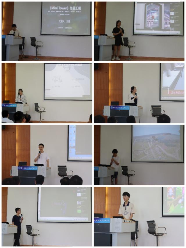会上同时展示了《裸眼3D》《MiniTower》《逃离海岛》《虚拟数字人制作》《数字人文旅》《数字孪生智慧公园》《web3.0益健康-项目演示》《非遗茶文化仿真平台》八个优秀作品。学生们从项目背景、设计思路、特色与创新、总结与体会等方面对作品进行详细介绍,并演示了自己的作品。这些作品不仅展示了学生们的专业能力和创新创意,也彰显了VR学院的教学质量和培养成果。