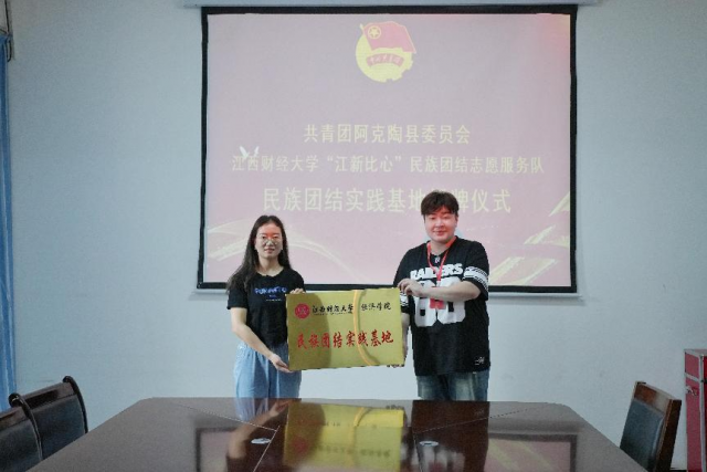 为进一步推进新时代高校民族团结进步教育工作,铸牢中华民族共同体意识,7月17日上午,阿克陶县团委与江西财经大学经济学院“江新比心”民族团结实践队在阿克陶县政府举行“民族团结实践基地”揭牌仪式,阿克陶县团委书记李红景、副书记古丽波斯坦·达尔曼、经济学院辅导员谢尔艾力·库尔班出席仪式。