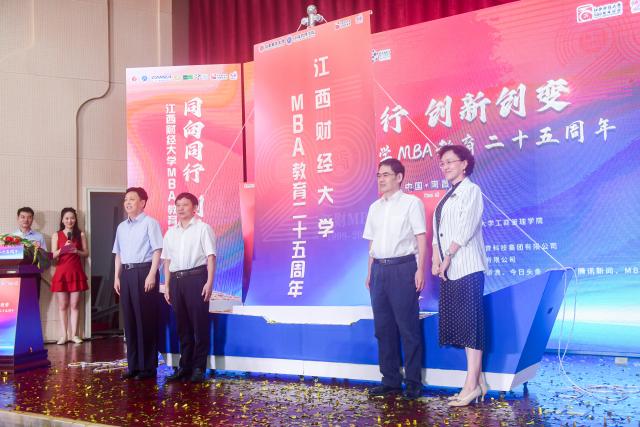弦歌不辍、扬帆启航。大会伊始,江西省政协原副主席汤建人,校党委书记卢福财,全国MBA教育指导委员会秘书处办公室主任、中国学位与研究生教育学会工商管理专业学位工作委员会秘书长、教育部学位中心高质量认证办公室副主任王萍,学校校友总会会长、校党委原书记王乔共同启动纪念活动。