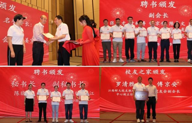 袁雄向名誉会长、会长颁发聘书。罗锐向副会长颁发聘书。黄雨虹向秘书长、副秘书长颁发聘书。罗清胜向金华(义乌)校友会颁发“校友之家”牌匾。