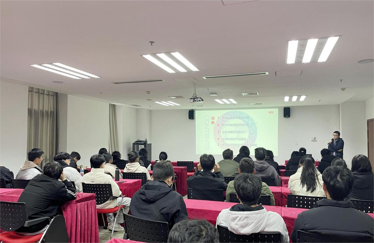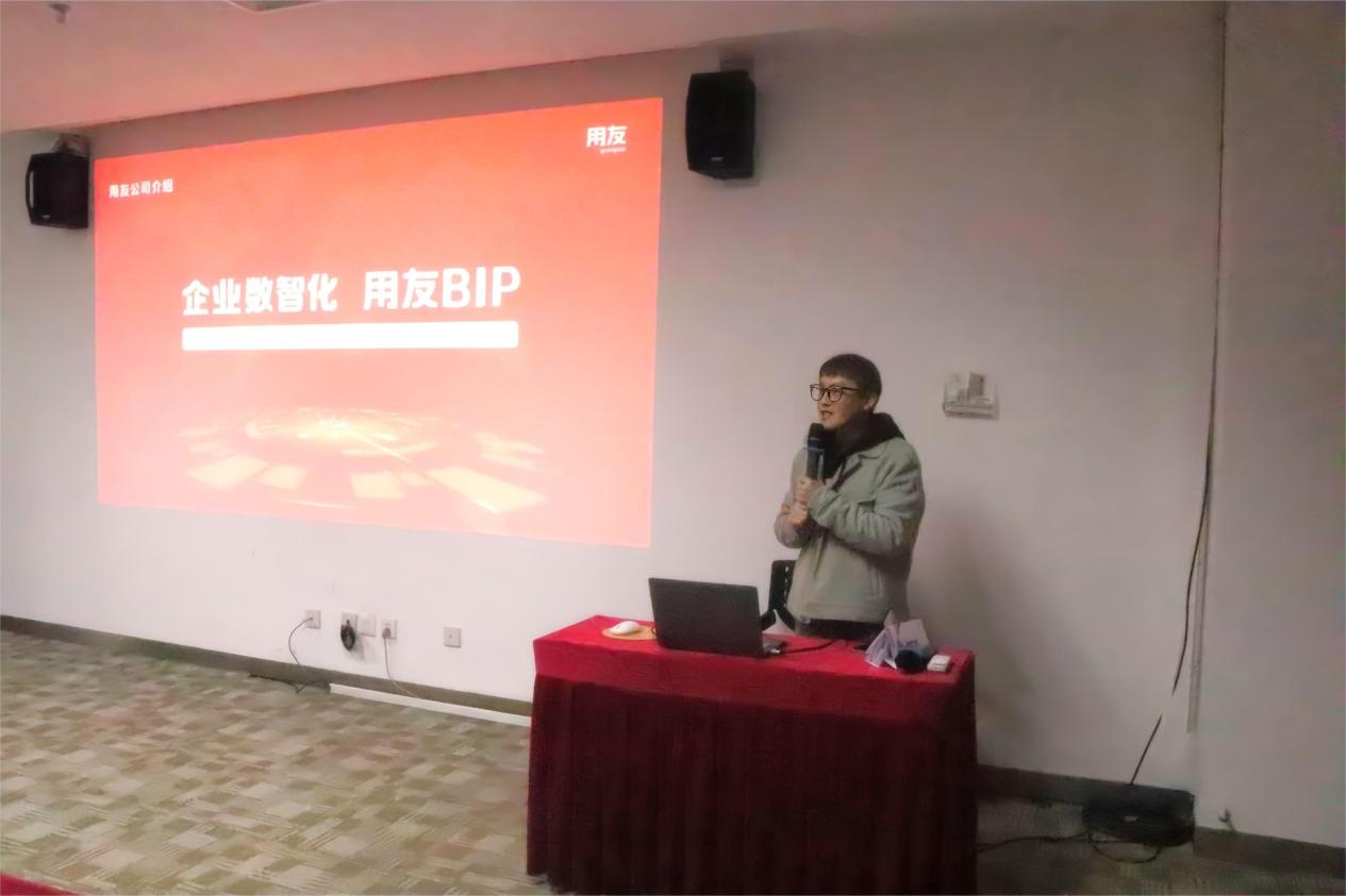 江老师代表公司向师生们的到来表示热烈欢迎,并向大家介绍了用友集团发展历程、组织架构与人才培养体系,并就专业方向与职业规划等同大家进行交流。江老师提到,经过35年的积累和发展,用友集团从传统财务会计软件供应商成长为全球领先的云服务和软件的提供商,为制造、零售、医疗等行业的“企业数智化”转型提供了创新型解决方案,欢迎大家积极深入了解用友,加入用友。