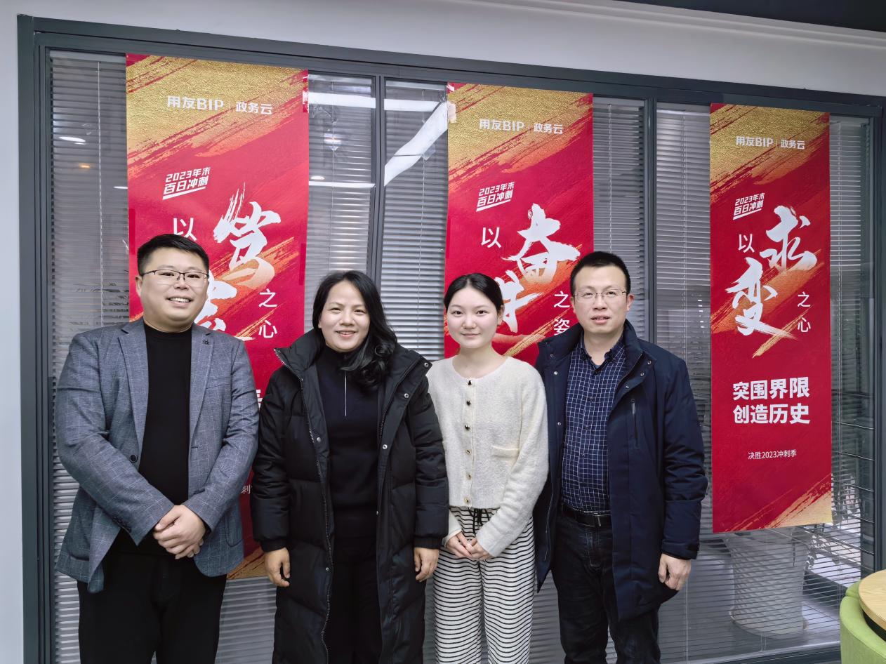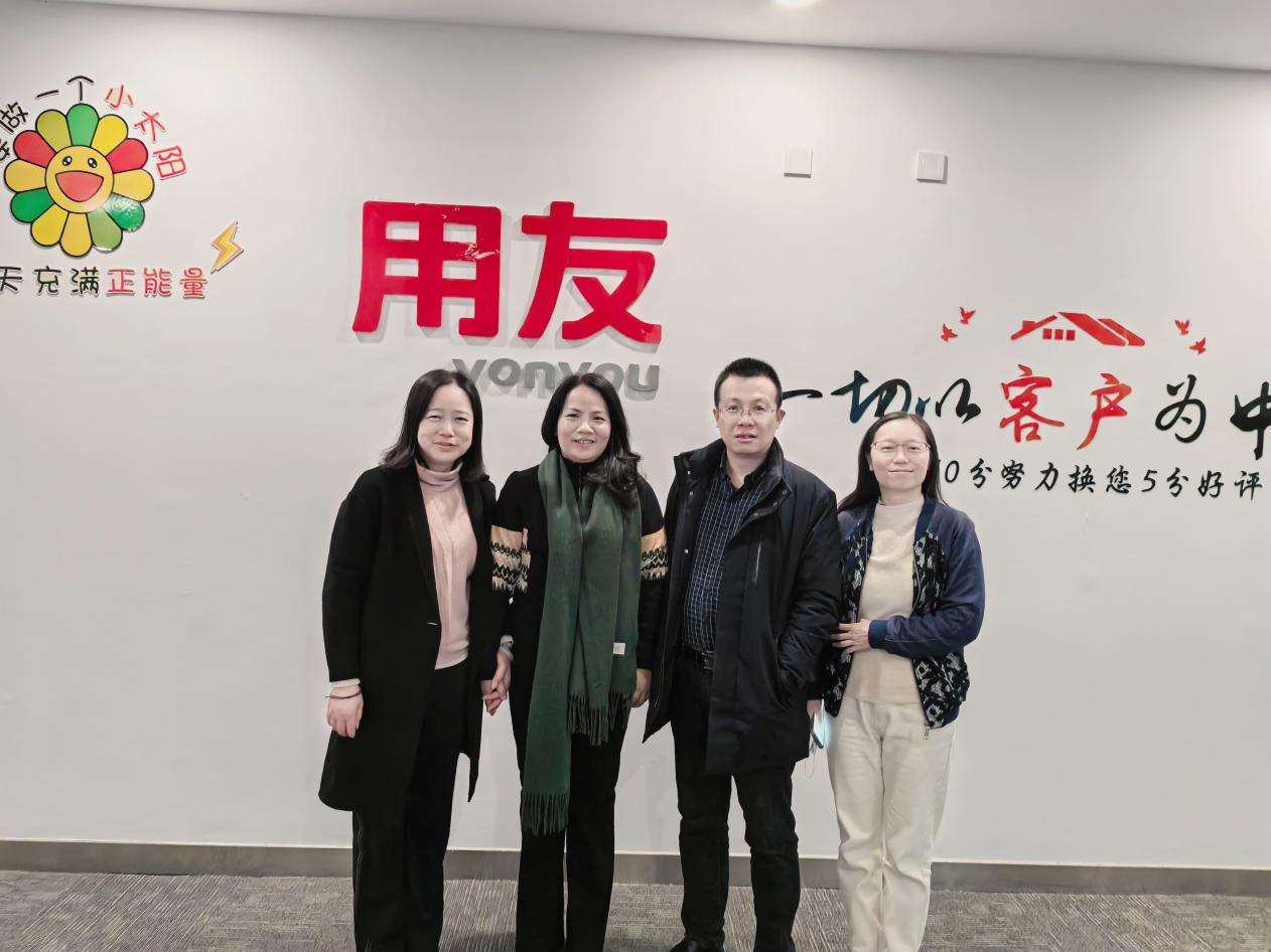 用友新道华东区总经理丁立波,新道科技股份有限公司江西区总经理王文江,用友新道科技股份有限公司教学服务经理江雷热情迎接了匡琳一行,双方在用友(南昌)产业园语音中心大楼进行深入座谈交流。