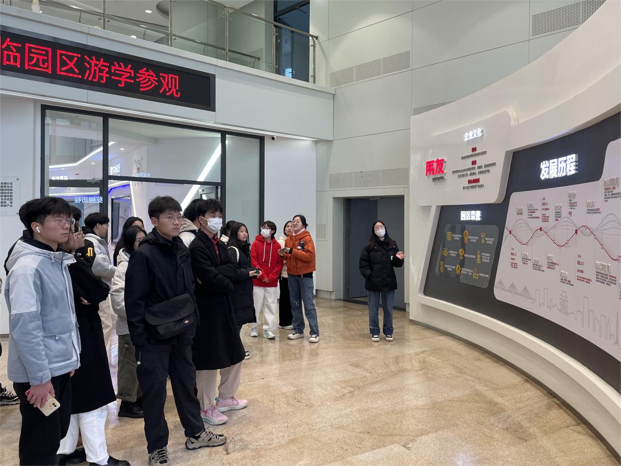 在用友新道科技股份有限公司教学服务经理刘晓奕的带领下,师生们走进用友数智体验馆,深入了解了用友在财务、人力、采购、研发、协同等核心领域的数字化创新成果以及企业数字化转型案例。