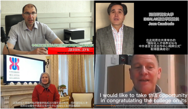 白俄罗斯莫吉廖夫国立大学校长杜克、马来西亚吉兰丹大学学术与国际副校长NgSiewFeon、西班牙国立大学语言学院院长胡安JuanCuadrado、波兰克拉科夫经济大学大卫·克劳斯教授线上连线发来视频祝贺。