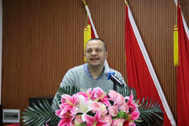 王金海代表现代经济管理学院对莅临大会的各位领导嘉宾致以热烈的欢迎和衷心的感谢,并就现代经济管理学院发展历程、专业学科建设、师资队伍以及国际化工作做了介绍,表示现代经济管理学院始终重视国际化工作,通过国际交流拓展人才培养模式,强化师资队伍建设。他表示,中外语言交流合作中心的成立标志着现代经济管理学院在国际交流与合作方面迈出了更为坚实的步伐。该中心将致力于为现代经济管理学院及属地学生学习外语,为中外语言交流合作、世界多元文化互学互鉴搭建友好协作的平台,为国际化人才的培养提供更为广泛的机会。