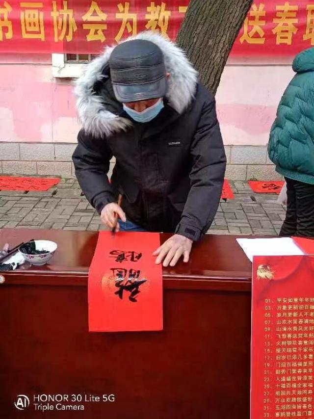 为了办好此次活动,老年书画协会进行了认真的准备,一是挑选了5位写春联比较好的会员各写40副,以备活动时教工选用;二是举办了写送春联交流研习活动,相互学习交流,为提高书写技巧和作品质量用了充分准备;三是精心准备书写春联内容,选用每年老百姓家门口常用对联,内容多样化,有适用于乔迁、升学的,也有适用于老年养生保健的,更有独具龙年时代特色的。共精选出60条吉言(对联内容),20条喜语(横幅内容),供不同家庭选用,让春联文化更具特色,更加大众化。正是:一副春联遂心愿,一条横批意境长。家和人顺百业兴,龙腾虎跃永安康。