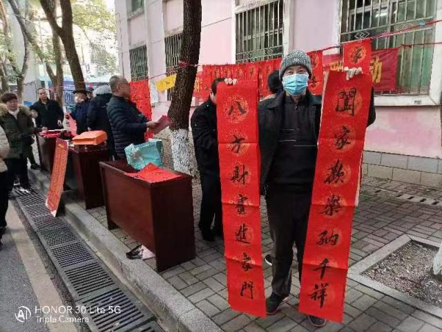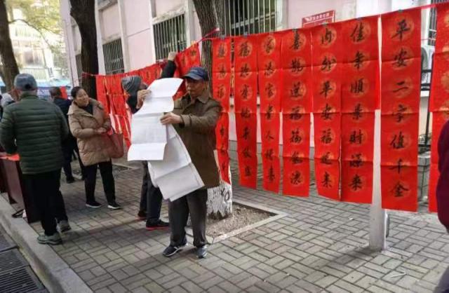 在活动现场,老年书协会员习勤、张志洪、李萍、游永保等紧张有序地悬挂春联,让前来欣赏的教工挑选。几位主写春联的会员,不畏寒冷,身带龙气,正在“选笔备墨四肢松,思考字形神志静;全神贯注挥毫墨,赏心悦目乐无穷。”一副副精美的春联从他们笔下流出,师生们一边等待,一边欣赏,一边赞美,“好!好!写得好!请帮我再写两副,你们写的春联不仅字好看,内容更贴切,更接地气。”书写现场的人行道上,铺满了刚写好的春联,教职工们耐心守护,等待墨迹干后带走。几个小时后,事先写好悬挂的200副春联和现场书写的105副春联,全部选送一空。活动快结束时,仍有不少的教工前来要求写送春联,会员们只好承诺再买些空白春联写好后送与给他们,以此感谢他们对老年书协的信任、支持和厚爱。