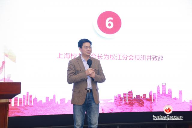 张利江为松江分会授旗、颁发名誉会长及顾问颁发聘书并致辞,他代表上海校友会对到会的各位嘉宾和校友表示亲切的慰问,并对松江分会的成立表示祝贺。他指出,从事校友工作需要有四心:爱心、热心、公心和恒心;要扮演好三个角色:服务者、参与者、组织者;要落实好校友会组织三个定位:江财情缘的链接纽带、职业事业的促进平台、信敏廉毅的心灵港湾。