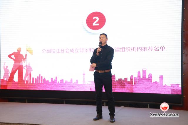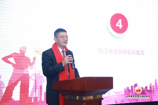 松江分会会长吴建刚作就职发言。他首先代表广大松江校友对各位来宾表示感谢,他强调,校友是一种称谓,也是一种关系,更是一种情怀,缘起江财,缘聚松江。松江分会是江财在上海的第一个区域性分会,它的成立离不开各位校友们的鼎力支持,松江分会将学习兄弟校友会的宝贵经验,努力为松江校友提供多方面的展示舞台,让松江分会成为大家回忆往昔的港湾、生活共享的平台和事业互助的资源,成为年轻校友成长道路上的良师益友。