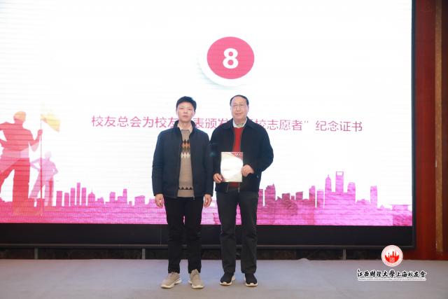 罗清胜为上海校友会“校友之家”授牌并为6位校友代表颁发“爱校志愿者”证书。目前江财校友会已在全国设立42个“校友之家”,“校友之家”品牌初步形成,上海校友会“校友之家”成功挂牌标志着江财人在上海有了温馨的家园。上海300余位校友志愿者,他们的默默奉献为校友工作打下了坚实的基础。其中特别为78级校友康志强大师兄颁发上海001号“爱校志愿者”纪念证书,以致敬康志强20多年来不辞辛苦为校友服务!