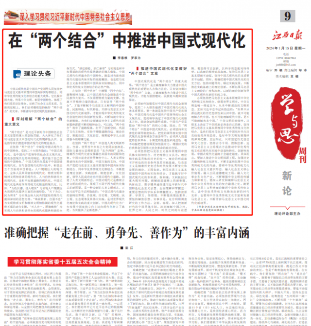1月15日,《江西日报》“学与思”版块刊登我校副校长李春根教授的理论文章《在“两个结合”中推进中国式现代化》。