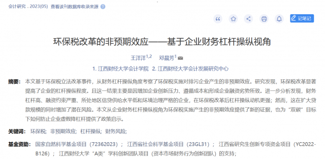 近日,会计学院教师王洋洋博士与2021级博士生邓晨芳合作撰写的论文《环保税改革的非预期效应——基于企业财务杠杆操纵视角》,在国内B+期刊《会计研究》2023年第5期发表。