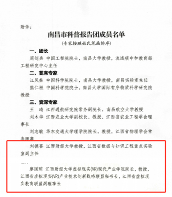 4月15日,南昌市科学技术协会公布了由周创兵等14名院士、专家为首批成员的南昌市科普报告团专家名单。其中,江西省数据与知识工程重点实验室副主任、信息管理学院刘德喜教授,虚拟现实(VR)现代产业学院院长、江西省虚拟现实(VR)产业技术创新战略联盟秘书长廖国琼教授入选。
