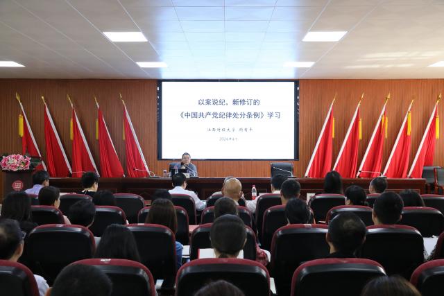 顾有平紧紧围绕《条例》中的“政治纪律、组织纪律、廉洁纪律、生活纪律、群众纪律、工作纪律”六个方面,结合详实的案例,以幽默生动的语言,深入浅出地解读了六大纪律的具体内容与重要意义,加深了师生对《条例》的理解。顾有平指出,各位党员特别是党员领导干部要坚持把政治纪律摆在首要位置,提高自身的政治敏感度,提高对网络言论的辨析能力。顾有平强调,开展党纪学习,一是要把六大纪律作为一个科学体系来把握,全面理解六大纪律的科学内涵和各项条文的实践要求,在学习、工作中自觉铸牢遵规守纪的思想防线;二是要深入理解纪律建设所蕴含的基本原理与本质要求,进而不断自我修炼、自我约束、自我改造,时刻自重自省、自警自励,真正做到心有所畏、言有所戒、行有所止。三是要强化责任担当,自觉接受纪律监督,要始终以一名优秀共产党员的标准严格要求自己。