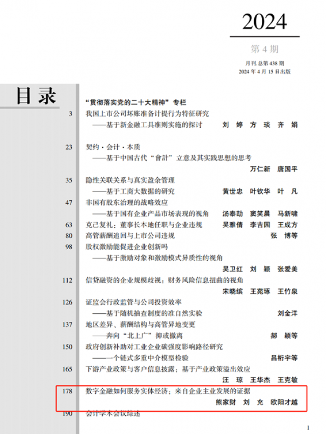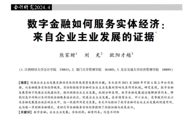 近日,会计学院熊家财教授与厦门大学刘充博士生、北京交通大学欧阳才越副教授合作完成的论文《数字金融如何服务实体经济:来自企业主业发展的证据》发表于国内权威A-期刊《会计研究》2024年第4期。其中,刘充为会计学院2020级会计学硕士,导师为熊家财教授。刘充于2022年7月提前毕业,进入厦门大学攻读会计学博士。