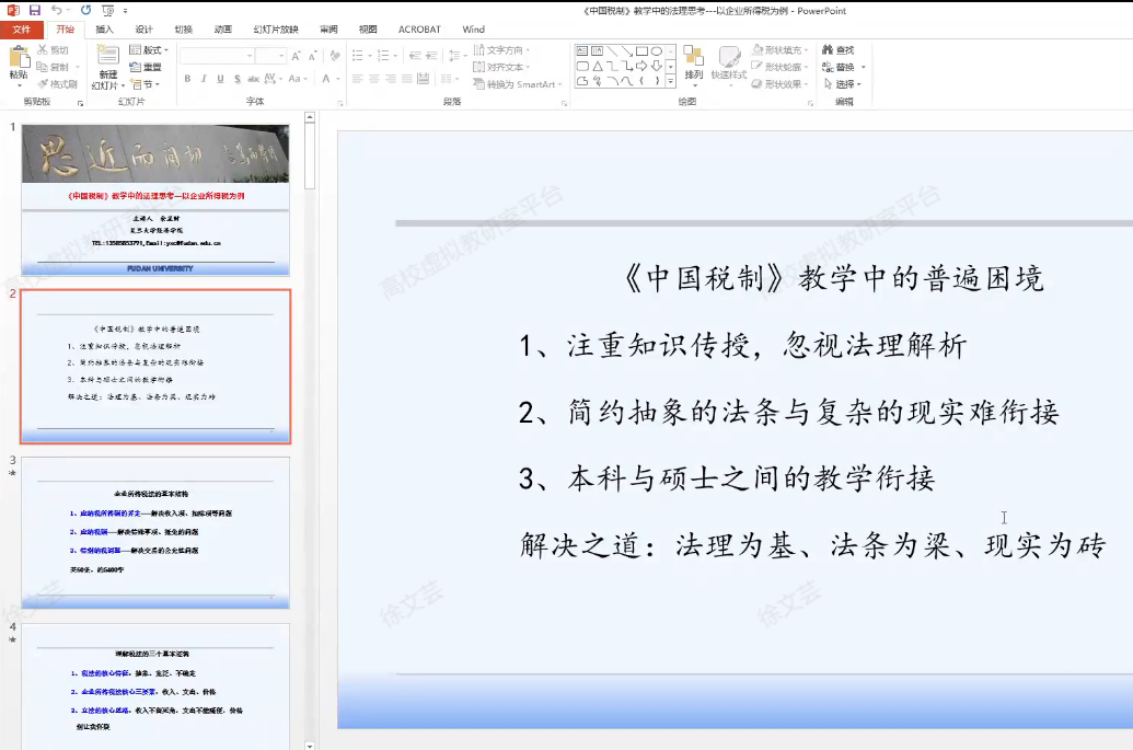 余显财教授首先指出了《中国税制》教学中的三大困境为:注重知识传授,忽视法理解析;简约抽象的法条与复杂的现实难衔接;本科与硕士之间的教学衔接。并提出解决之道为:法理为基,法条为梁,现实为砖。