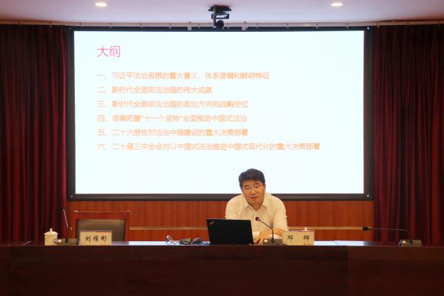 辅导报告阶段,邓辉围绕“习近平法治思想的重大意义、体系逻辑和鲜明特征”“新时代十年全面依法治国的伟大成就”“新时代全面依法治国的政治方向和战略定位”“准确把握‘十一个坚持’全面推进中国式法治”“党的二十大报告对法治中国建设的重大决策部署”以及“党的二十届三中全会对以中国式法治推进中国式现代化的重大决策部署”等方面进行系统宣讲和深入阐释。他指出,把国家改革、开放、发展、安全等各方面各领域工作全方位纳入法治轨道,在法治轨道上全面建设社会主义现代化国家、在法治轨道上推进国家治理体系和治理能力现代化、在法治轨道上全面推进法治中国建设,铺就中国式现代化的法治轨道,是党的二十届三中全会的法治意义之所在。我们要以时不我待的紧迫感、夙夜在公的责任感,自觉扛起法治中国建设的光荣任务,推动全面依法治国工作走深走实,为全面建设社会主义现代化国家提供有力法治保障,以中国式法治护航中国式现代化。