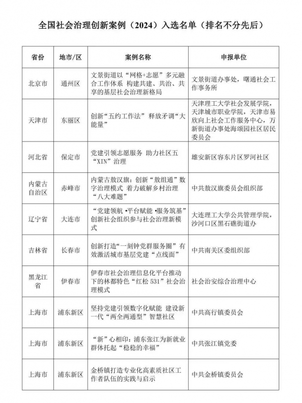 据悉,本届案例征集活动得到各地党政机关和社会各界广泛响应,活动组织方共收到申报案例724份,覆盖全国29个省(自治区、直辖市),内容涉及面广、针对性强,具有较好的代表性,体现了近年来各地加强和创新社会治理取得的新进展、新成效,反映了当下中国社会治理的诸多经验和智慧。本着公开、公平、公正原则,活动组织方研究制定了严谨、科学的评审规则,并组织国内社会治理领域专家学者开展评审。经过分类汇总、材料审核、专家会审等环节,共遴选出100份案例入选“全国社会治理创新案例(2024)”,30份案例入选“全国社会治理创新案例‘公益慈善专项奖’”。(编辑/雷伟杰 审核/一审 姜莹 二审 赵旻 终审 李大晖)