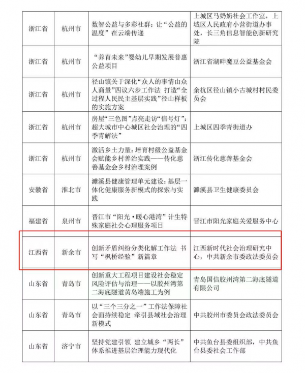 10月28日中国社会治理研究会发布全国社会治理创新案例(2024)入选名单,江西新时代社会治理研究中心和中共新余市委政法委员会报送的“创新矛盾纠纷分类化解工作法书写‘枫桥经验’新篇章”成功入选,成为江西省唯一入选的社会治理创新案例。