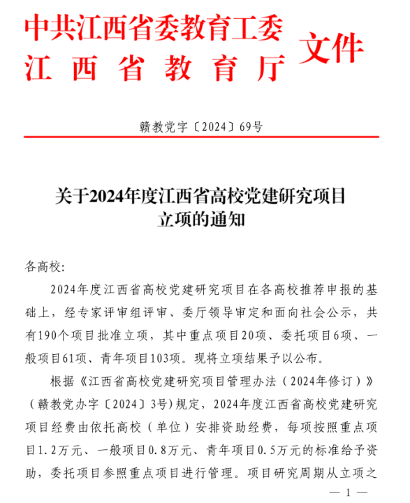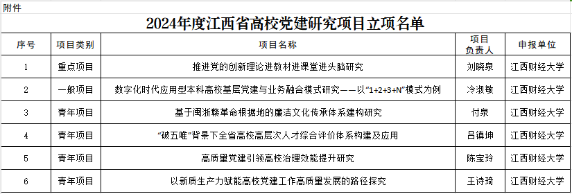 近日,中共江西省委教育工委、江西省教育厅公布了2024年度江西省高校党建研究项目立项名单,我校共有6项课题立项。其中,马克思主义学院刘晓泉院长主持的《推进党的创新理论进教材进课堂进头脑研究》立项重点项目,现代经济管理学院教师冷淑敏主持的《数字化时代应用型本科高校基层党建与业务融合模式研究——以“1+2+3+N”模式为例》立项一般项目,马克思主义学院教师付泉主持的《基于闽浙赣革命根据地的廉洁文化传承体系建构研究》、国际学院教师吕镇坤主持的《“破五唯”背景下全省高校高层次人才综合评价体系构建及应用》、财税与公共管理学院教师陈宝玲主持的《高质量党建引领高校治理效能提升研究》、现代经济管理学院教师王诗琦主持的《以新质生产力赋能高校党建工作高质量发展的路径探究》立项青年项目。