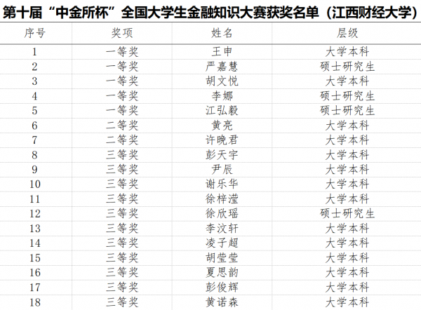 近日,第十届“中金所杯”全国大学生金融知识大赛圆满落幕。我校学子在比赛中展现出了卓越的专业素养和竞技实力,5人获全国一等奖,2人获全国二等奖,11人获全国三等奖,41人获全国优胜奖,总获奖人数在全国众多高校位列第二,其中本科生获奖49人,连续三年位列全国第一。