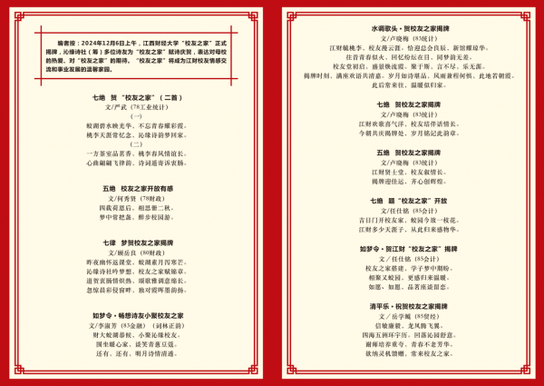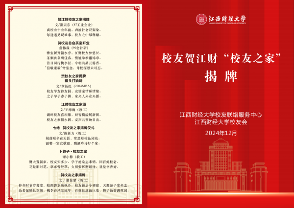 “蛟湖碧水映光华,不忘青春耀彩霞。校友天涯常忆念,沁缘诗韵梦回家”。副校长李春根、江西校友联席会执行会长兼秘书长章新挺、MBA校友会秘书长刘志鹏及学生代表共同为“校友之家”揭牌。沁缘诗社(筹)数位校友为“校友之家”赋诗庆贺,表达对母校的热爱、对“校友之家”的期待。“校友之家”将成为江财校友情感交流和事业发展的温馨家园。(文/校友联络服务中心 邢显黎 图/刘建芳 编辑/雷伟杰 审核/一审 姜莹 二审 赵旻 终审 李大晖)