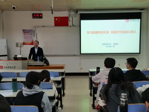 11月20日下午,党委常委、副校长李春根为税收学(数字税收)232班、行政管理(数字政务)231班、土地资源管理(评估与规划)231班的本科生讲授了题为“学习掌握财经纪律做遵纪守法的江财人”的“形势与政策”课。
