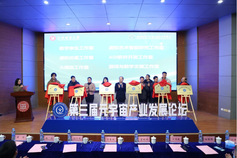 揭牌环节,随着红绸缓缓揭开,数字孪生工作室、大模型工作室、虚拟仿真工作室、游戏与数字文娱工作室、AGI软件开发工作室、虚拟艺术智能研究工作室六大校内创新工作室正式宣告成立,它们将成为学院推动元宇宙技术研究和应用创新的重要载体。