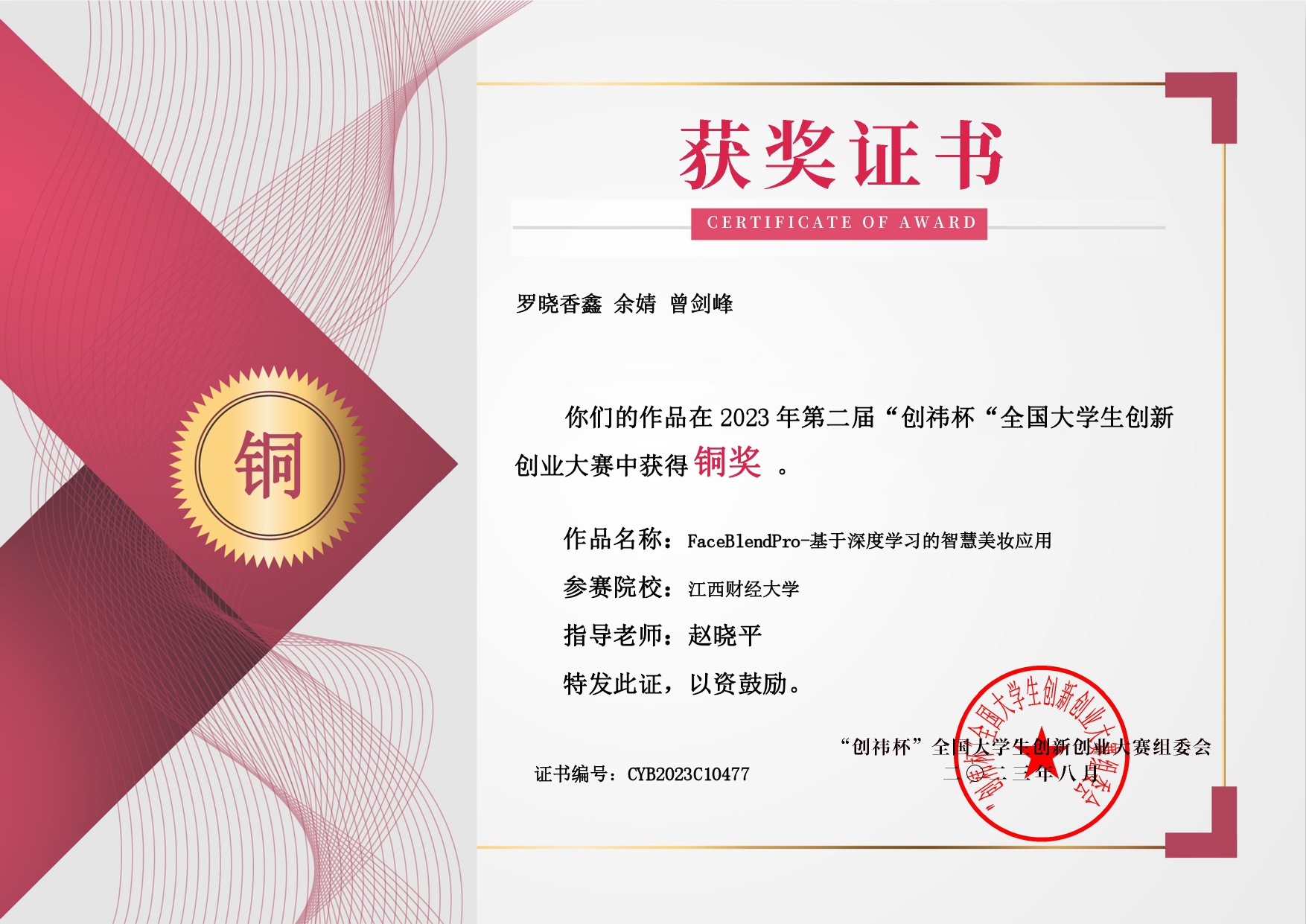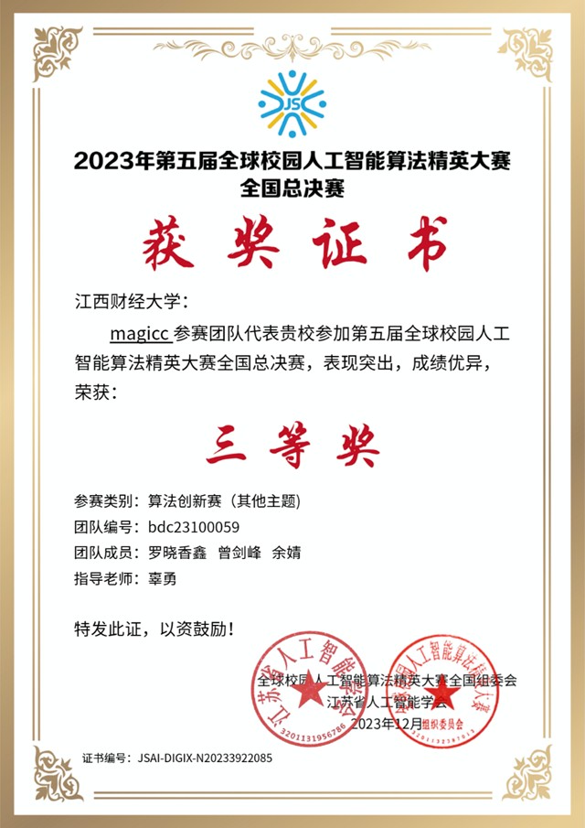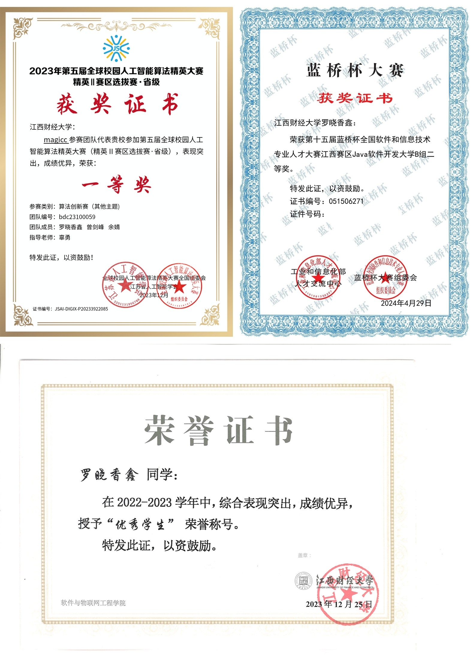 罗晓香鑫,女,中共党员,软件与物联网工程学院2021级软件工程专业本科生。学年加权成绩为97.12分,同年级同专业排名第三。在校期间,获得了国家励志奖学金、江西财经大学“自强之星”等荣誉称号,曾申请软件著作权2项,获得2023年JSAI算法创新赛II赛区一等奖、2023年“创祎杯“全国大学生创新大赛金奖、2023年第十八届学生科研课题获得立项资助、2024年大学生创新创业训练计划项目国家级立项、第五届全球校园人工智能算法精英全国总决赛三等奖、第十五届蓝桥杯全国软件和信息技术专业人才大赛江西赛区二等奖、第二十六届中国机器人及人工智能大赛人工智能创新赛江西赛三等奖。