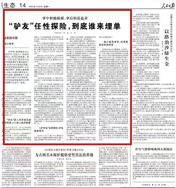 1月6日,《人民日报》生态版头条关注“江西:‘驴友’任性探险,到底谁来埋单?”报道就江西省首次对违规探险造成公共资源浪费行为追责为例,针对近两年户外徒步探险活动现象到底违不违规,违不违法?即便是未开发地带,是否就在法律管理之外?而安全事件发生后,又当如何追责等问题,我校工商管理学院副院长、教授胡海胜接受人民日报记者采访,并就以上问题进行深度解读。