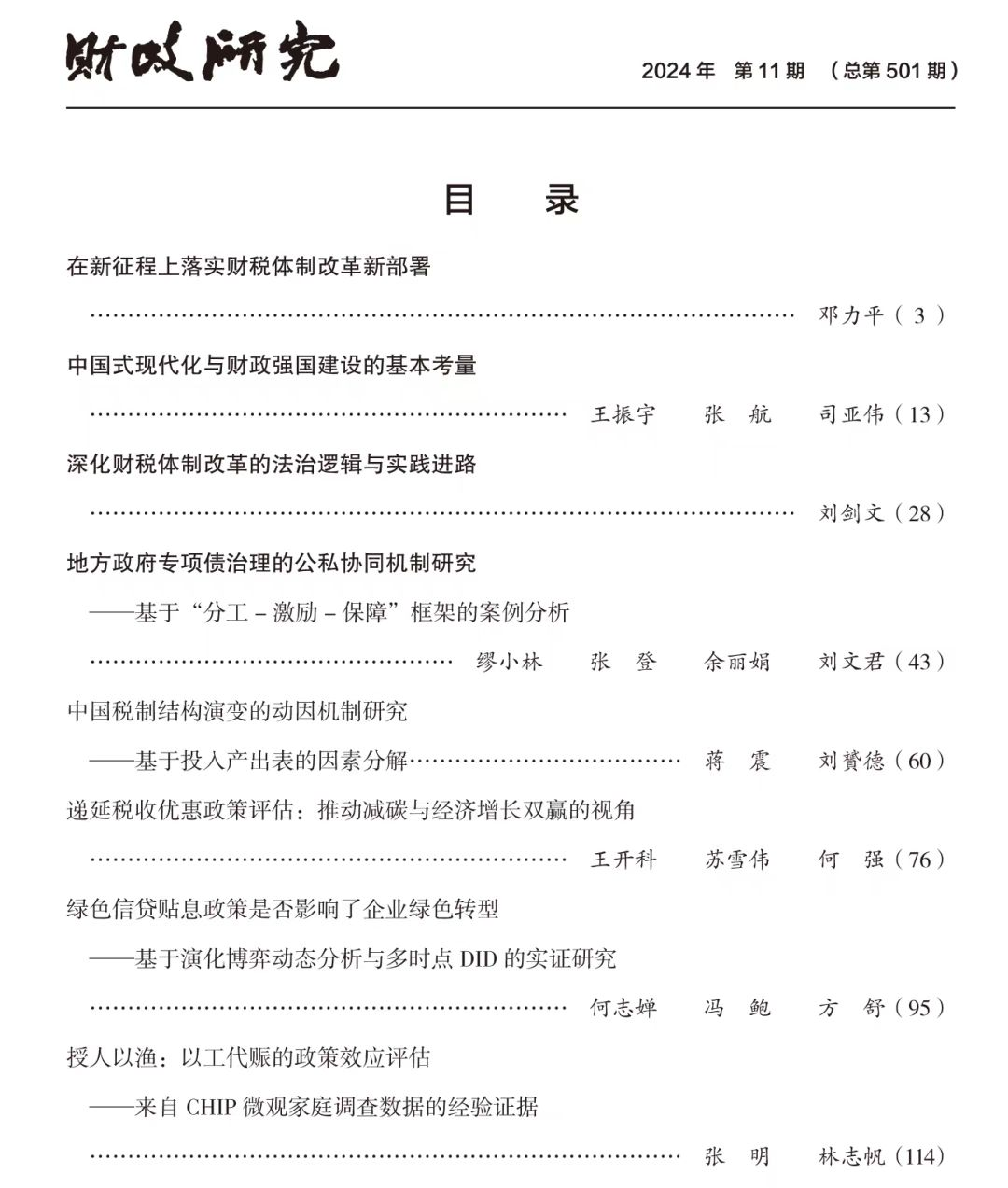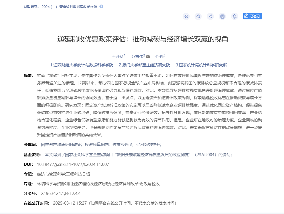 近日,统计与数据科学学院王开科教授与厦门大学邹至庄经济研究院博士研究生苏雪伟、国家统计局统计科学研究所何强研究员合作的论文《递延税收优惠政策评估:推动减碳与经济增长双赢的视角》发表于中文权威A-期刊《财政研究》2024年第11期。