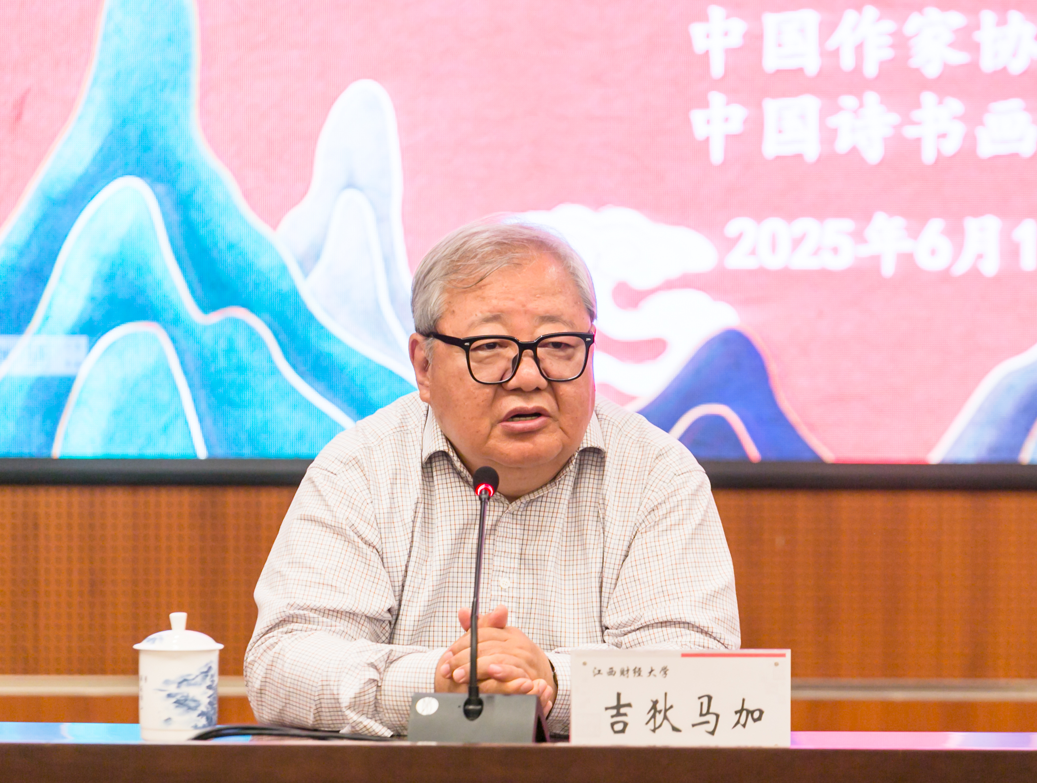6月15日上午,由中国诗书画研究会与江西财经大学主办,党委宣传部、教务处、社会与人文学院及中国诗书画研究会教育分会共同承办的“中国诗书画校园行”走进江财暨“新文科大讲堂”在我校举行。中国作家协会原副主席、书记处书记,中国诗书画研究会名誉会长吉狄马加应邀做客学校“新文科大讲堂”并作专题讲座。校党委书记刘耀彬、校长邓辉出席相关活动,党委常委、副校长阙善栋主持讲座。