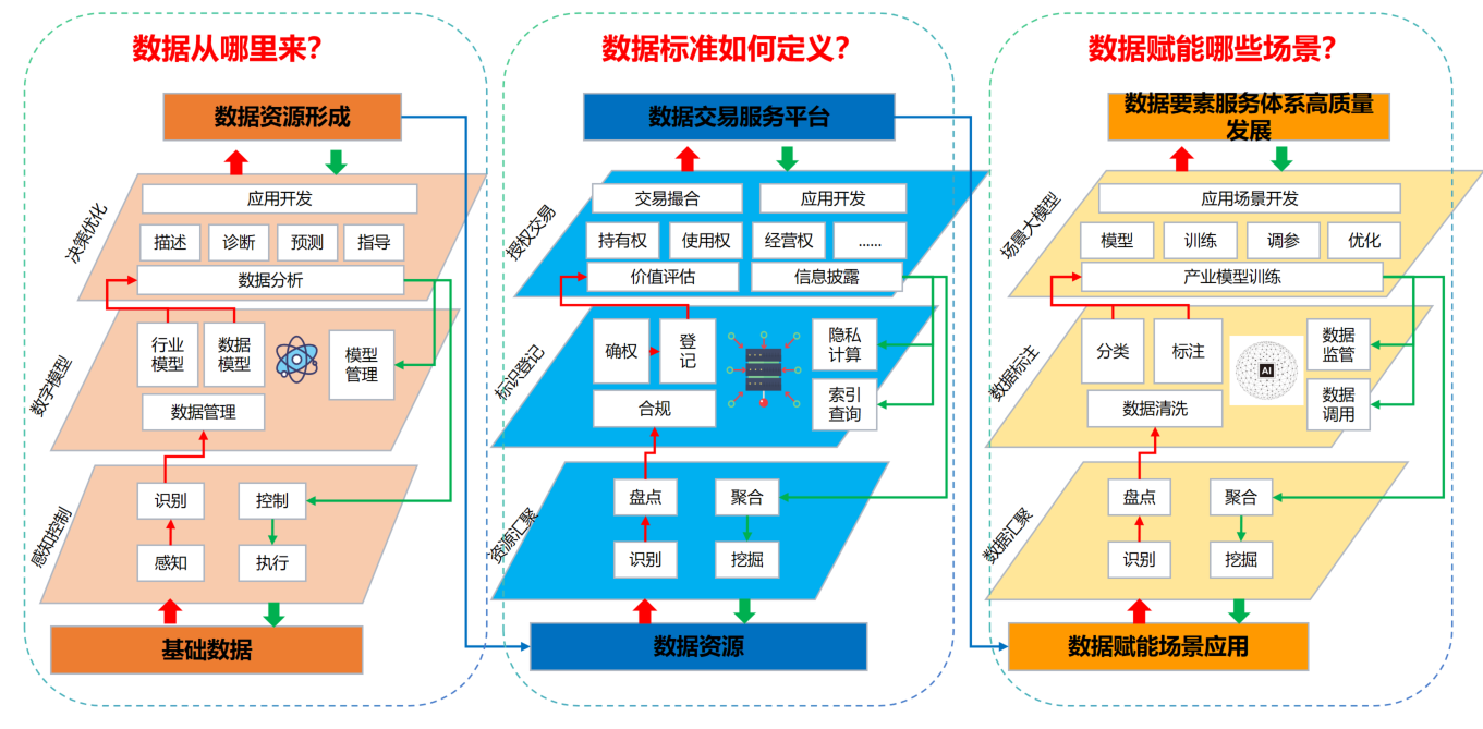 起点于多源异构的基础数据,通过系统化的数据管理活动(如识别、整合、挖掘、盘点、聚合)对原始数据进行处理与组织,实现数据资源化,形成结构化、可用的数据资源库。在此基础上,依托行业模型和数据模型的支撑,一方面驱动数据分析以优化决策并提供业务指导,另一方面则赋能下游的应用开发活动,形成具体的业务功能。最终,输出高质量、可复用的数据资源及成熟的应用程序成果,为后续数据进入交易流通市场和深入场景赋能奠定了坚实的资源与技术基础。