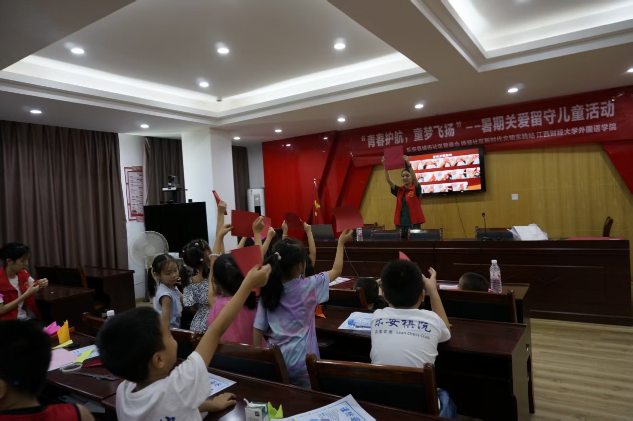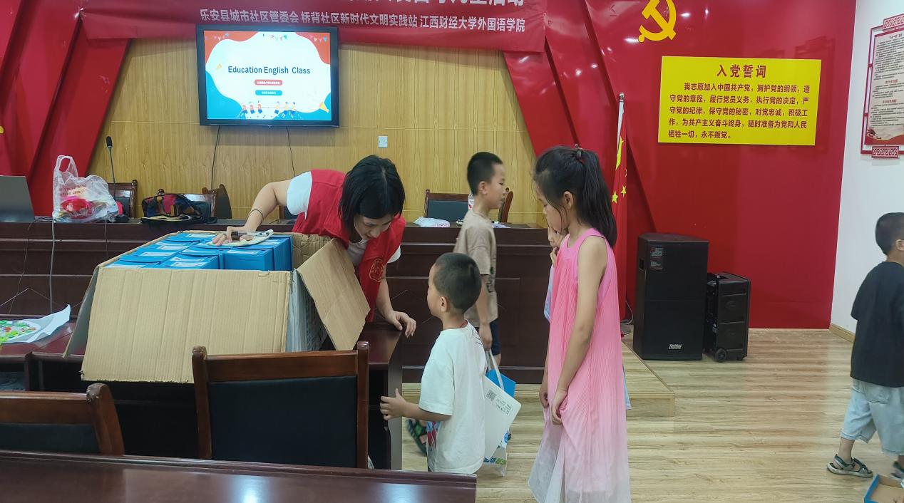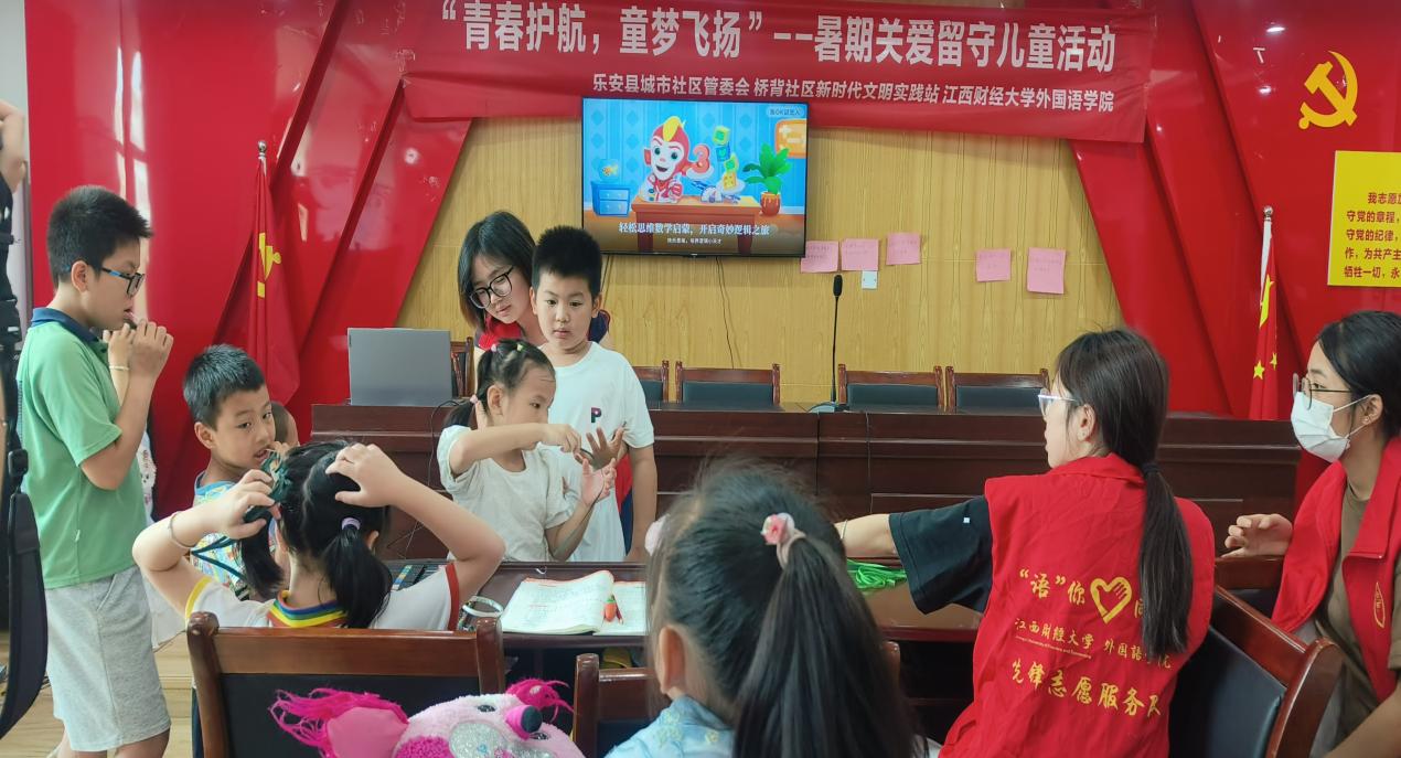 7月7日,桥背社区实践服务站成为知识与欢乐的海洋。实践队创新打造红色文化与英语融合课堂:志愿者化身“双语讲解员”,用生动故事带孩子们“云游”井冈山与乐安红色地标,并巧妙将“march(行军)”“salute(敬礼)”等英文词汇融入红色主题游戏,让革命历史教育与语言学习同频共振。