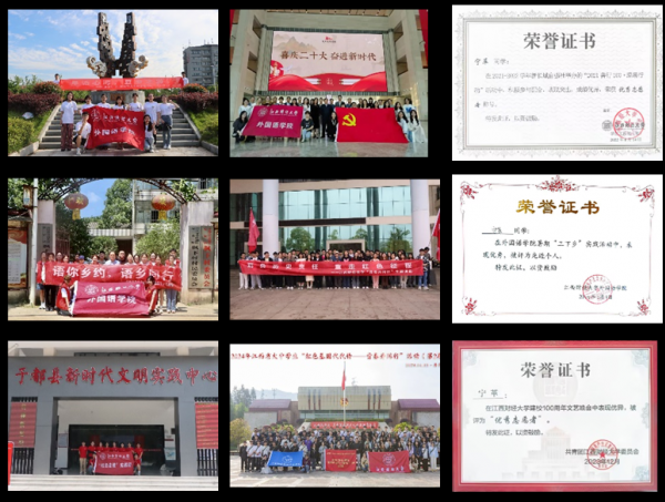 “纸上得来终觉浅,绝知此事要躬行”。宁革坚持以躬行为实,注重实事求是。连续两年参加三次暑期“三下乡”社会实践活动,2023年暑期担任学院“语”乡同行实践队队长,带领团队获评校“三下乡”优秀团队。除此之外,她积极参与万企调研、红色走读等活动,完成多项实践课题、青马课题。寒假期间,她积极参与“返家乡”社会实践活动,用自己的专业知识为乡村振兴贡献力量,获评校级先进个人称号。以躬行为实,宁革的跬步终有所积。