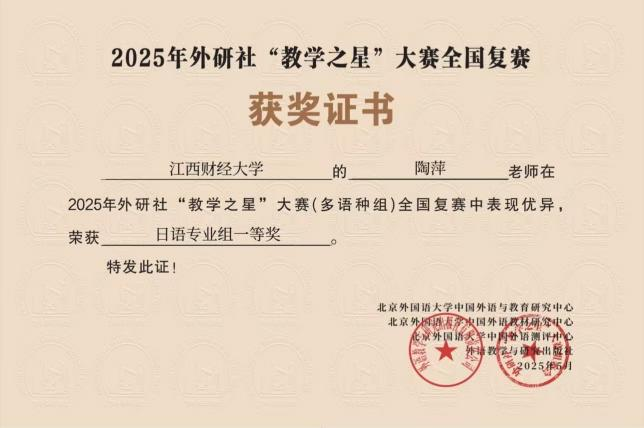外国语学院陶萍老师以全国复赛一等奖的优异成绩晋级总决赛。在总决赛中,她创新性地运用《理解当代中国》日语演讲教程,以“用世界语言,讲好中国故事”为教学核心,巧妙结合数智技术开展教学。通过AI工具辅助学生进行演讲训练,有效提升了学生的语言准确性、逻辑思维能力和跨文化传播意识,实现了“技术赋能语言,语言传递价值”的教学目标。陶萍凭借精心设计的教学方案和精彩纷呈的课堂表现,在众多参赛选手中脱颖而出,荣获日语专业组全国总决赛一等奖。