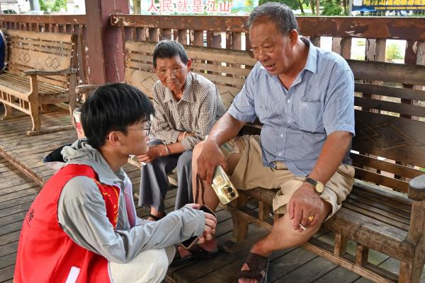 下午,队员们来到文化长廊,在避暑乘凉的老人与孩子中展开访谈,围绕酒席礼金、邻里关系等议题探讨移风易俗的实际成效。多数村民表示支持简化礼节,反对过度攀比,体现出“新风尚”正逐步深入人心。