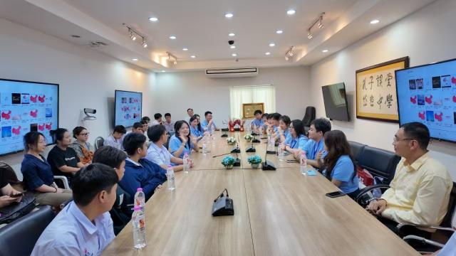 7月29日下午,实践团前往全球首家孔子学院——曼谷岱密中学孔子学院进行文化交流。在课堂长刘晓东引导下,师生一同参观二楼的文化展柜,沉浸式体验中国戏曲服饰、紫砂茶具、中医器具等文化展陈,感受传统智慧与现代传承的碰撞。