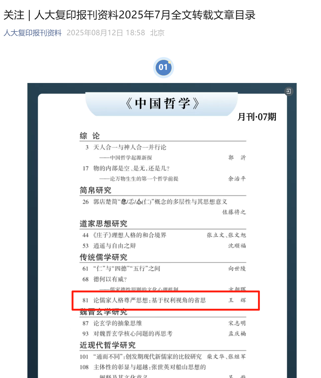 近日,人大复印报刊资料2025年7月全文转载法学院副教授王辉理论文章《论儒家人格尊严思想:基于权利视角的省思》。
