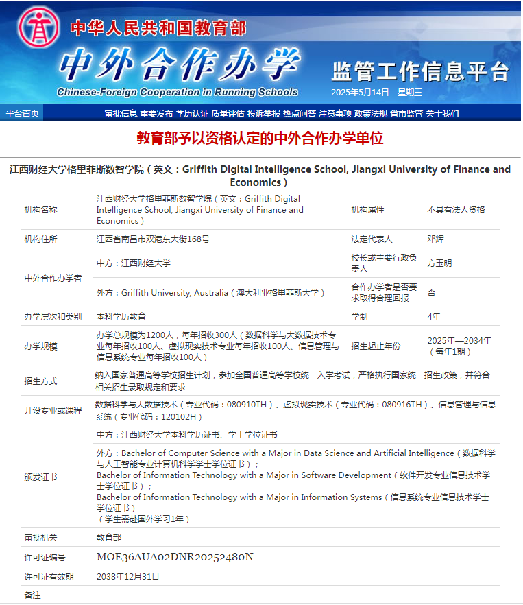 在中外合作办学领域,学校以突破式发展书写江西高教新篇章。2025年,与澳大利亚格里菲斯大学(QS世界排名第243位)合作设立的江西财经大学格里菲斯数智学院获教育部批准,成为江西省首个中外合作办学非独立法人机构,填补了省内该领域空白。该机构聚焦数字经济与人工智能前沿,采用“3+1”双学位模式,直接引入澳方优质课程与师资,为学子提供在当地接受国际教育的机会。同时,学校构建起成熟的中外合作办学项目矩阵:1998年获批的中美工商管理硕士项目持续稳定运行,2015年启动的中瑞软件工程本科项目累计培养大批复合型人才,2023年获批的中俄数字经济本科项目(江西省近两年唯一获批)实现“当年获批、当年招生、当年受益”,首批即招收111名学生。学校将以格里菲斯数智学院为示范,推动现有项目提质增效,扩大中美MBA、中瑞软件工程等项目招生规模,同时拓展与全球前300强院校在优势学科的合作,力争申报研究生层次的中外合作办学项目,让中外合作办学惠及更多群体。