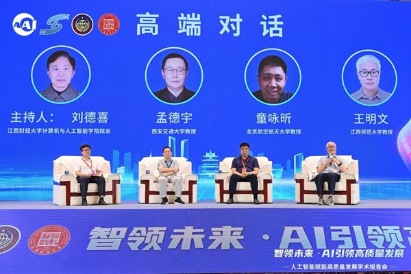 下午的专题报告环节、高端对话环节由江西财经大学计算机与人工智能学院院长刘德喜主持。在专题报告环节,浙江大学教授许超、西安交通大学教授刘均、北京师范大学教授黄华、国防科技大学教授赵翔分别就智能控制、跨媒体问题求解、基础教育大模型与知识融合等前沿课题发表演讲,展示了人工智能在多学科交叉中的创新应用。在高端对话环节,浙江大学教授杨易、西安交通大学教授孟德宇、北京航空航天大学教授童咏昕、江西师范大学教授王明文就人工智能的未来发展方向、技术挑战与产教融合等议题展开深入讨论。