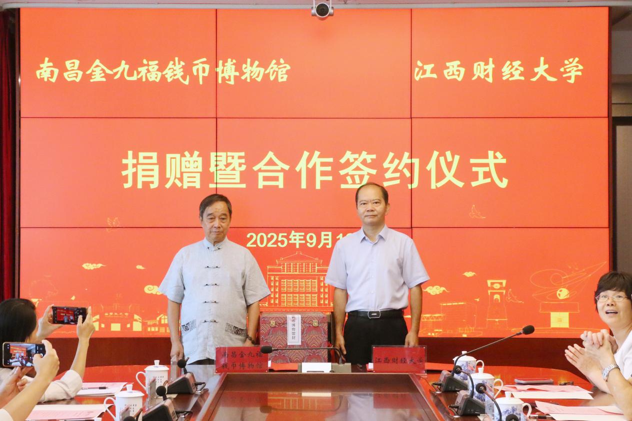 南昌金九福钱币博物馆创始人金家栋先生将其精心收藏的红色货币、革命文献和史料等共计237件正式捐赠给学校。刘耀彬为其颁发了捐赠证书。